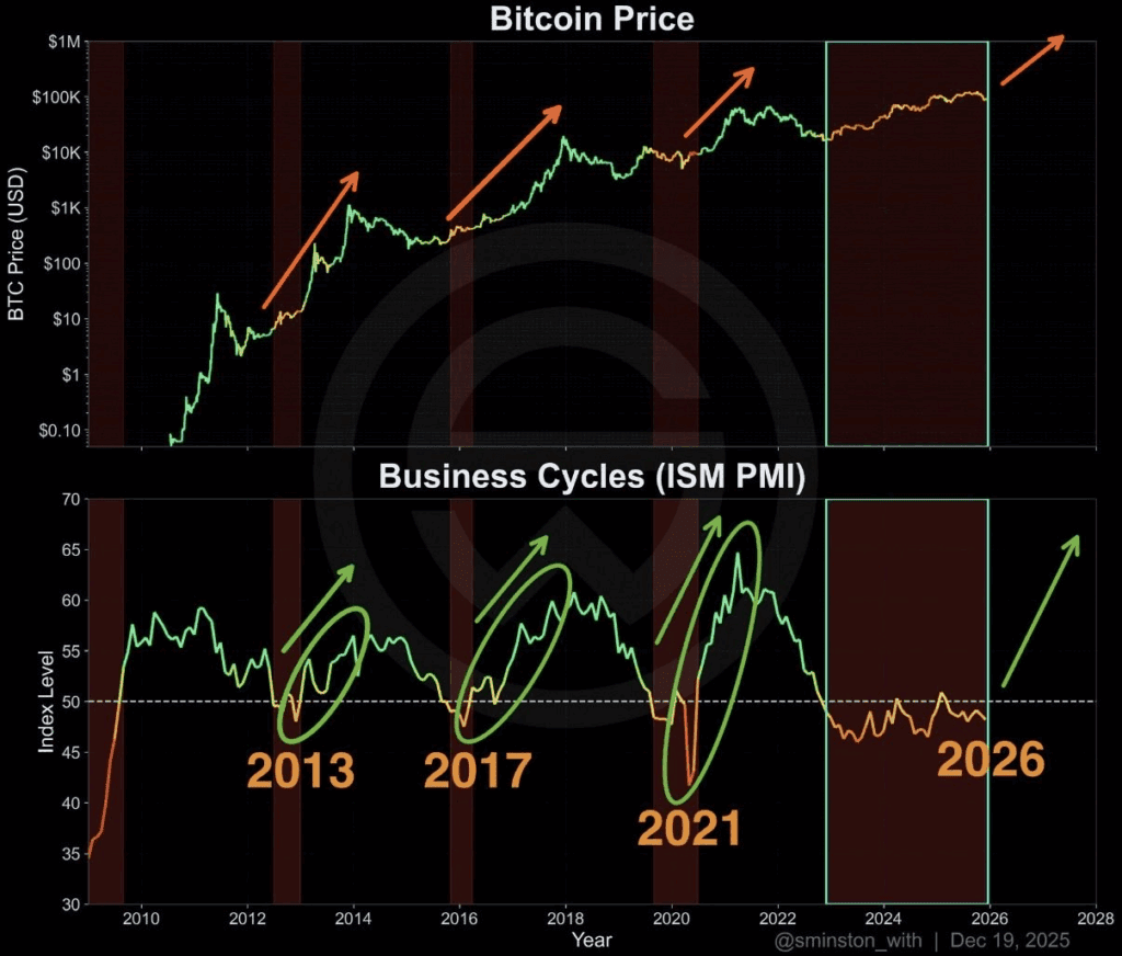The Logic: Bitcoin historically tops out 12–18 months after the liquidity expansion enters its “mania” phase. If the ISM Manufacturing PMI crosses back above 50 in early 2026, the perfect storm should unfold throughout 2026, setting up a blow-off top, potentially in the first half of 2027.