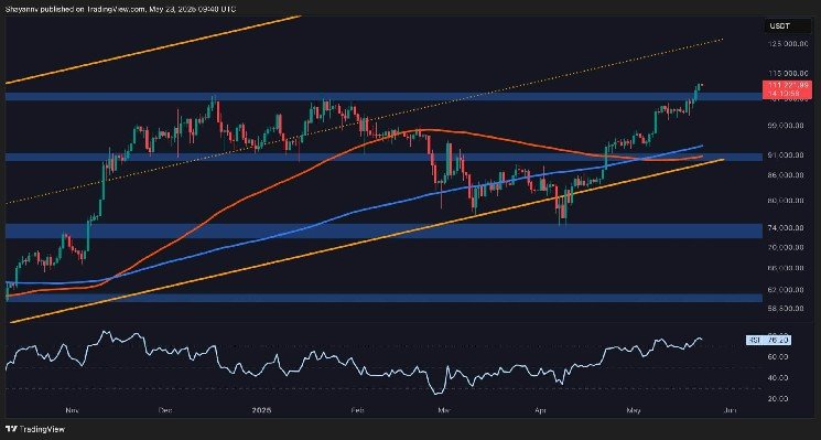 Sur le délai quotidien, l’évasion a été propre et convaincante. Le prix a traversé la zone de résistance de 100 000 $, suivi d’un rassemblement rapide vers la barre de 110 000 $. La structure haussière reste intacte, les moyennes mobiles de 100 jours et 200 jours offrant un fort soutien dynamique à 90 000 $ et 92 000 $, respectivement.