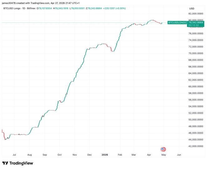 At the same time, the large Bitfinex whale, closely tracked for directional pricing, remains near cycle peak long exposure. Holdings currently sit at 79,342 BTC, just shy of the 80,100 BTC high. This entity typically divests its position once a local bottom is all but confirmed or when there is clear upside momentum.