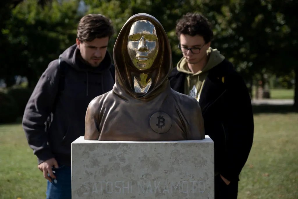 A statue of Satoshi Nakamoto, a presumed pseudonym used by the inventor of Bitcoin, is displayed in Graphisoft Park in Budapest, Hungary in 2021. Janos Kummer/Getty Images