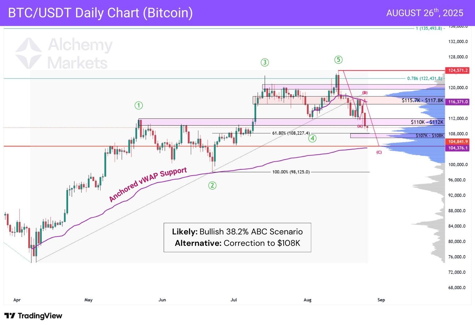 However, there’s now a new scenario to be aware of: a bounce at the $107,000 to $108,000 zone. This is the 61.8% Fibonacci retracement of June to mid-August’s uptrend, which aligns with a high volume node.