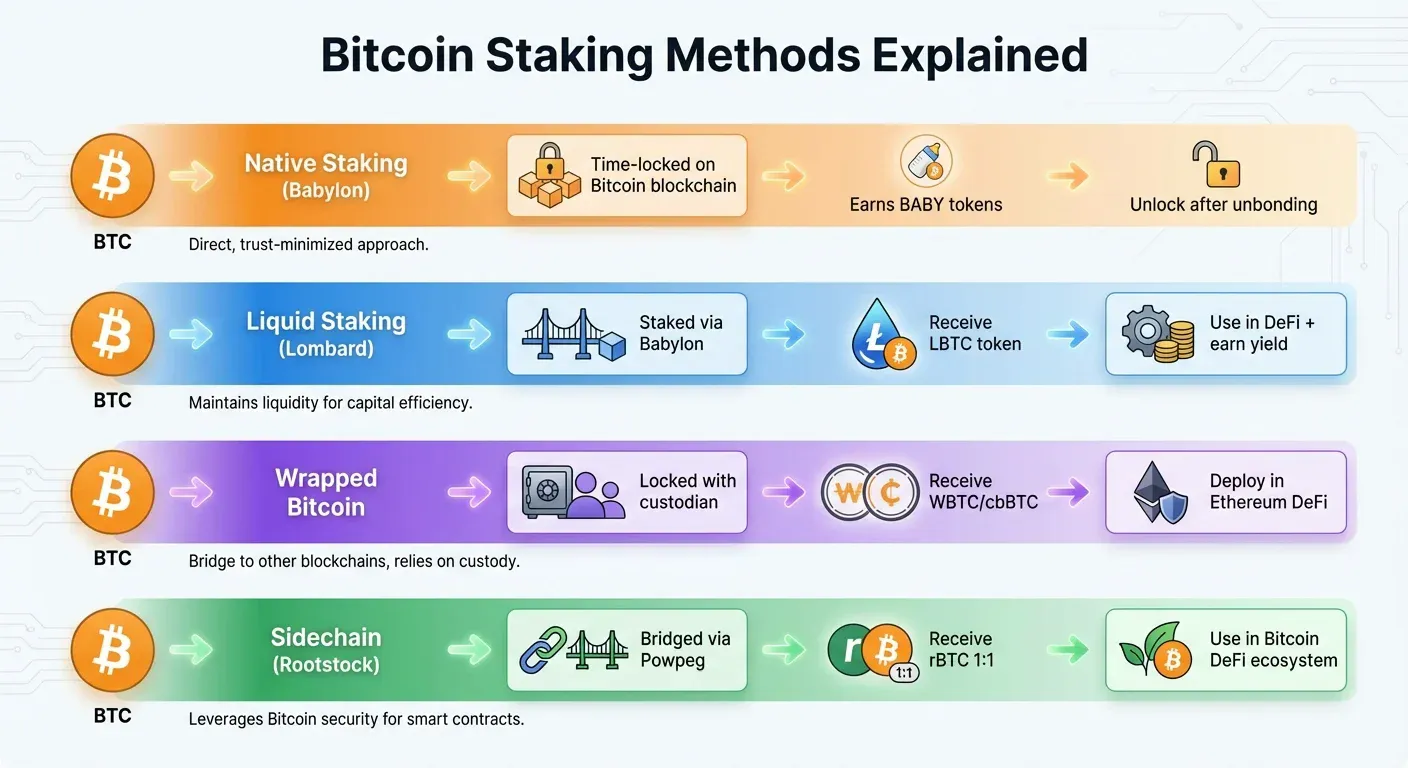 Alt text: Infographic comparing four Bitcoin staking methods: Native Staking via Babylon (time-locked on Bitcoin blockchain, earns BABY tokens), Liquid Staking via Lombard (receive LBTC token for DeFi), Wrapped Bitcoin (WBTC/cbBTC locked with custodian for Ethereum DeFi), and Sidechain via Rootstock (bridged via Powpeg to receive rBTC 1:1 for Bitcoin DeFi ecosystem).