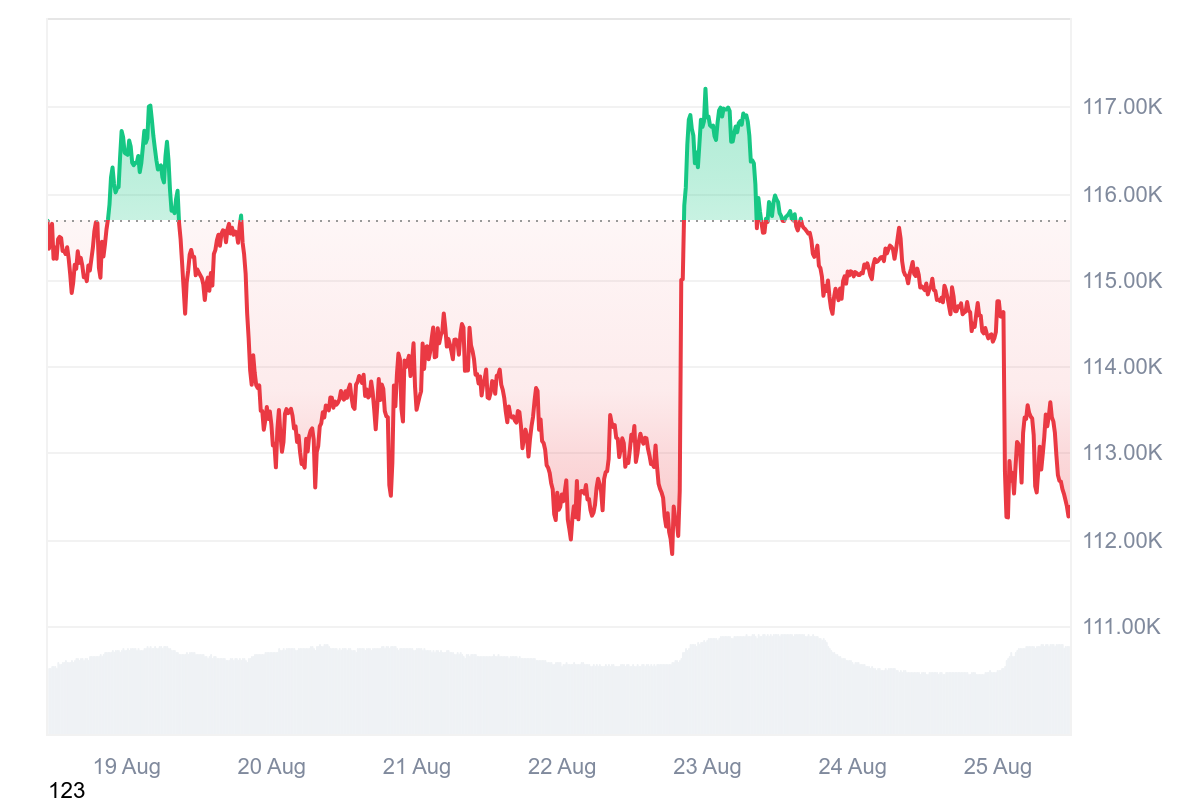 Despite gaining a bullish stance on Powell’s Jackson Hole speech, the Bitcoin price came crashing down late Sunday. With a 2.5% drop over a 24-hour frame, BTC currently trades at $111.8k with $2.22T in market capitalization.