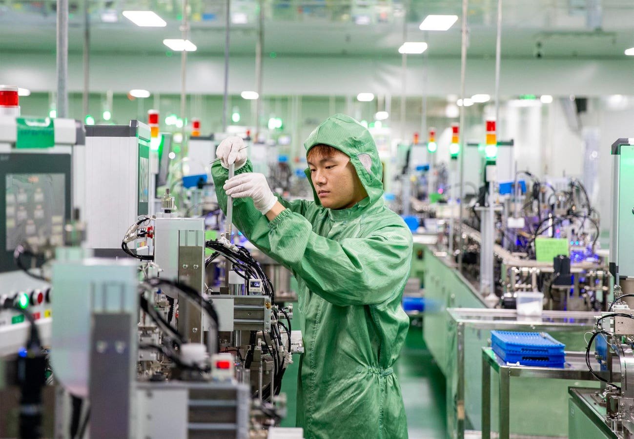 A worker is producing ultra-miniature bearings at Nantong Shankou Kinetic Energy Technology Co., Ltd. in Nantong High-tech Zone, in Nantong, China, on August 14, 2024. (Photo by Costfoto/NurPhoto via Getty Images)