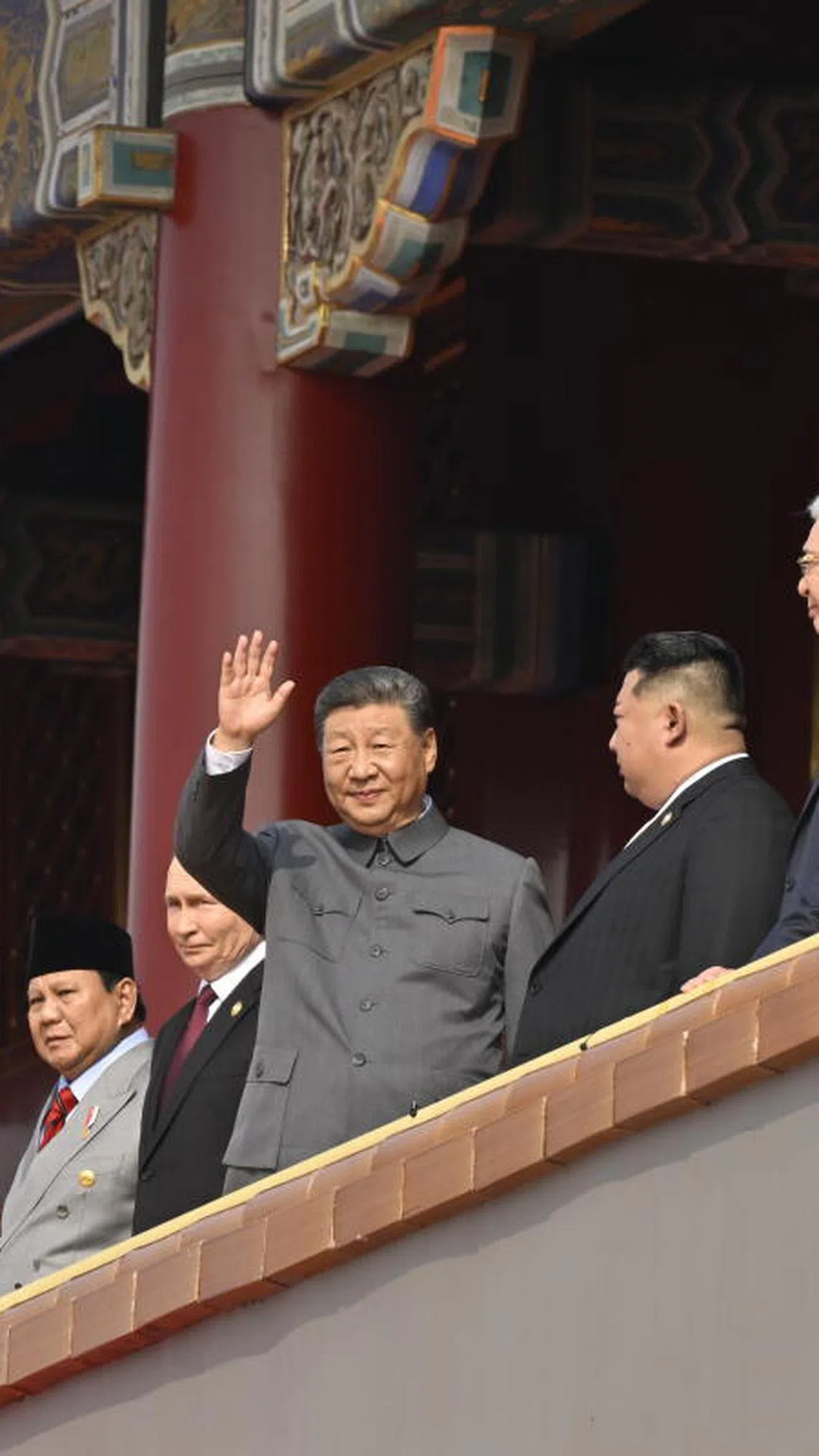 (From left) Indonesian President Prabowo Subianto, Russian President Vladimir Putin, Chinese President Xi Jinping, North Korean leader Kim Jong Un and Kazakhstan President Kassym-Jomart Tokayev on the Tiananmen rostrum during the military parade on Sept 3.