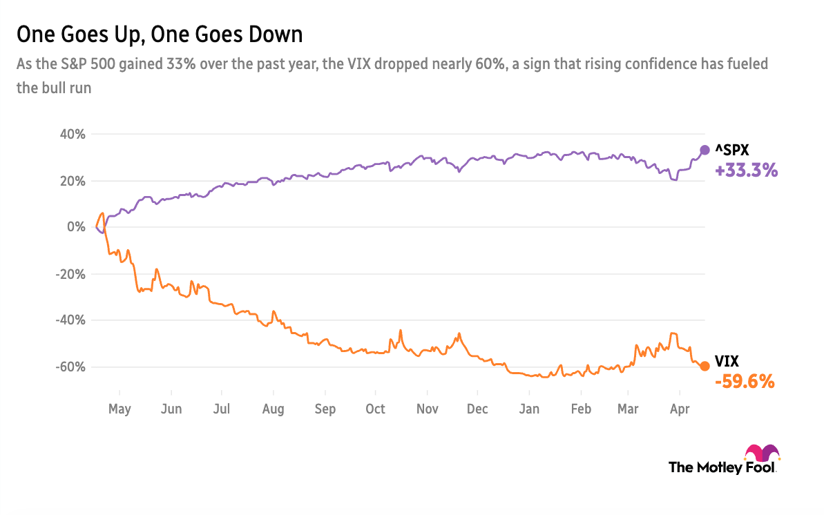 The S&P 500 (^GSPC +1.20%) has climbed 7% since April began, erasing most of a rough first quarter. The VIX (^VIX 2.56%) — Wall Street’s “fear gauge” — has dropped 41% from its March peak, signaling calmer conditions heading into earnings season.