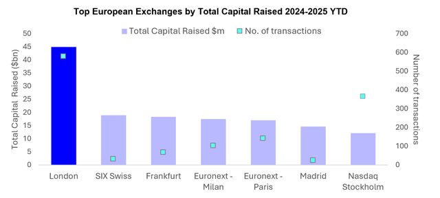 London isn’t just Europe’s financial capital, it remains a global powerhouse. From the start of 2024 to 2025 YTD, the UK ranks fifth globally in equity capital raised, with $44.9 billion raised across 579 transactions. The London Stock Exchange is the largest venue in Europe, consistently outperforming its continental peers in both capital raised and market capitalisation. London-listed companies collectively hold a market value that is $2.7 trillion larger than the next biggest European exchange.