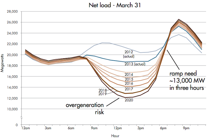 But because the boom in rooftop solar PV is not controlled by utilities, there are some genuine implications for the cost of keeping the rest of the grid operating reliably. With enough rooftop solar, the daily patterns of power supply and demand change dramatically.